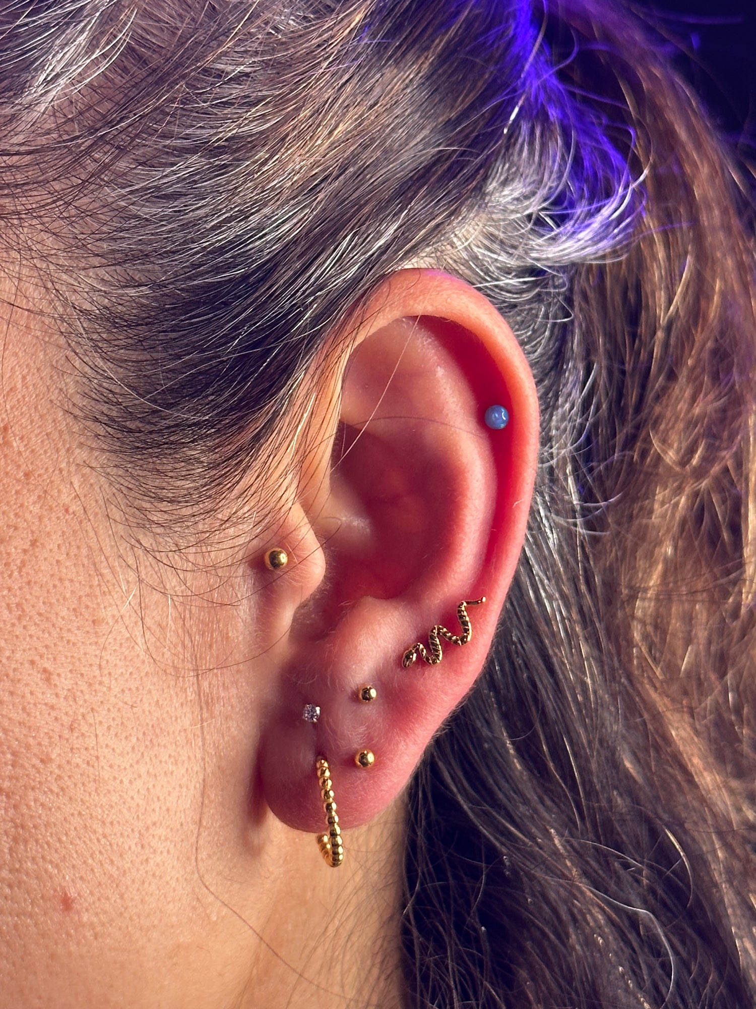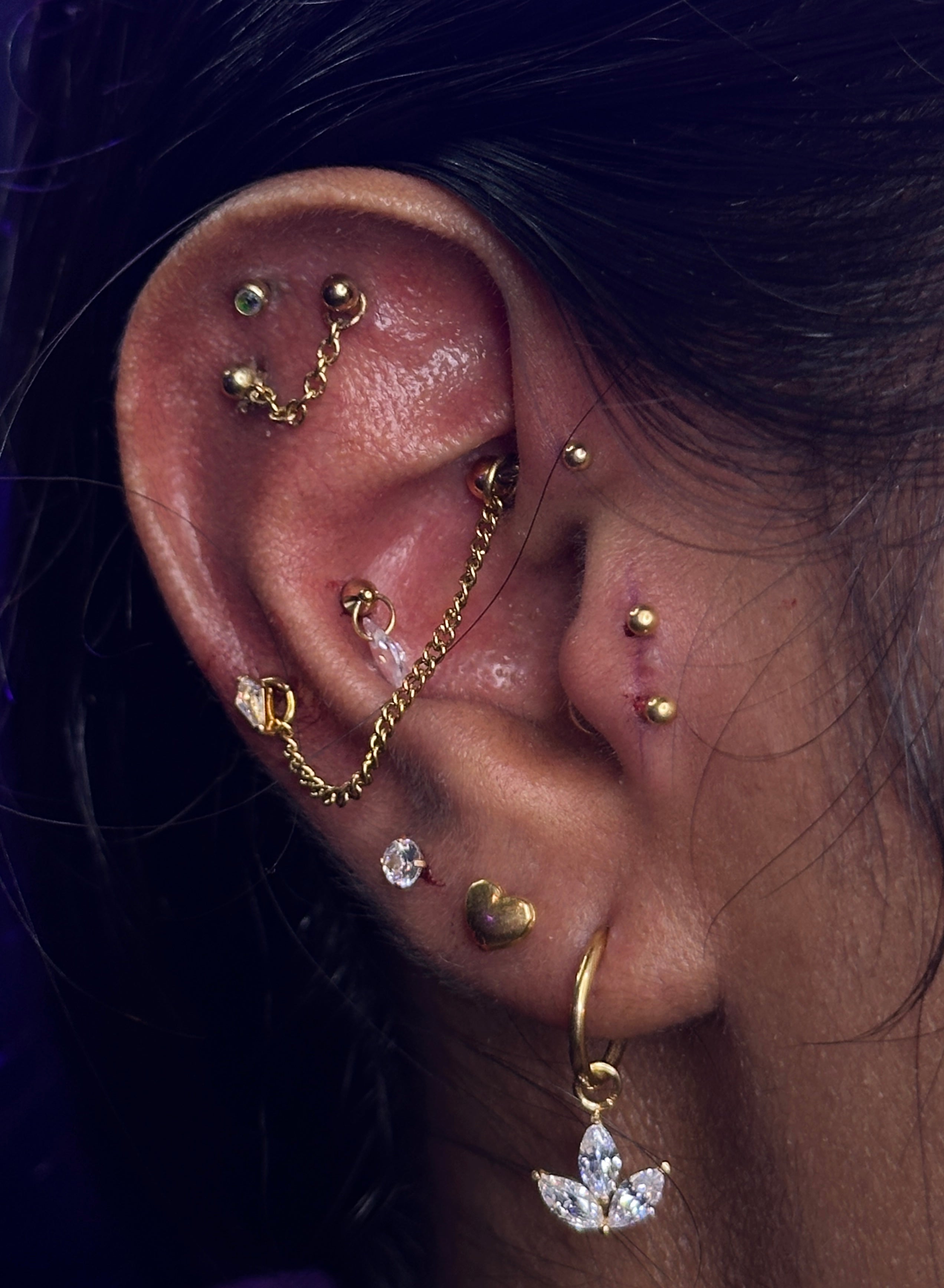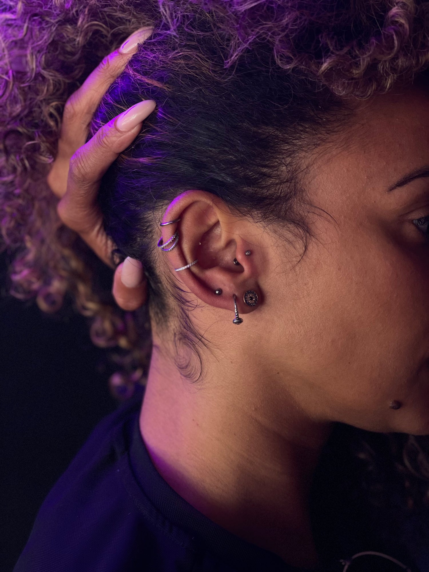 For everyone, whether you are starting from scratch or have existing ear piercings, we cater to everyone! If you already have piercings, we can take your current style to the next level by replacing the jewelry with more refined pieces, adding new piercings, or of course both. And for those starting from scratch, welcome to the cool side where we help you create your unique ear style.