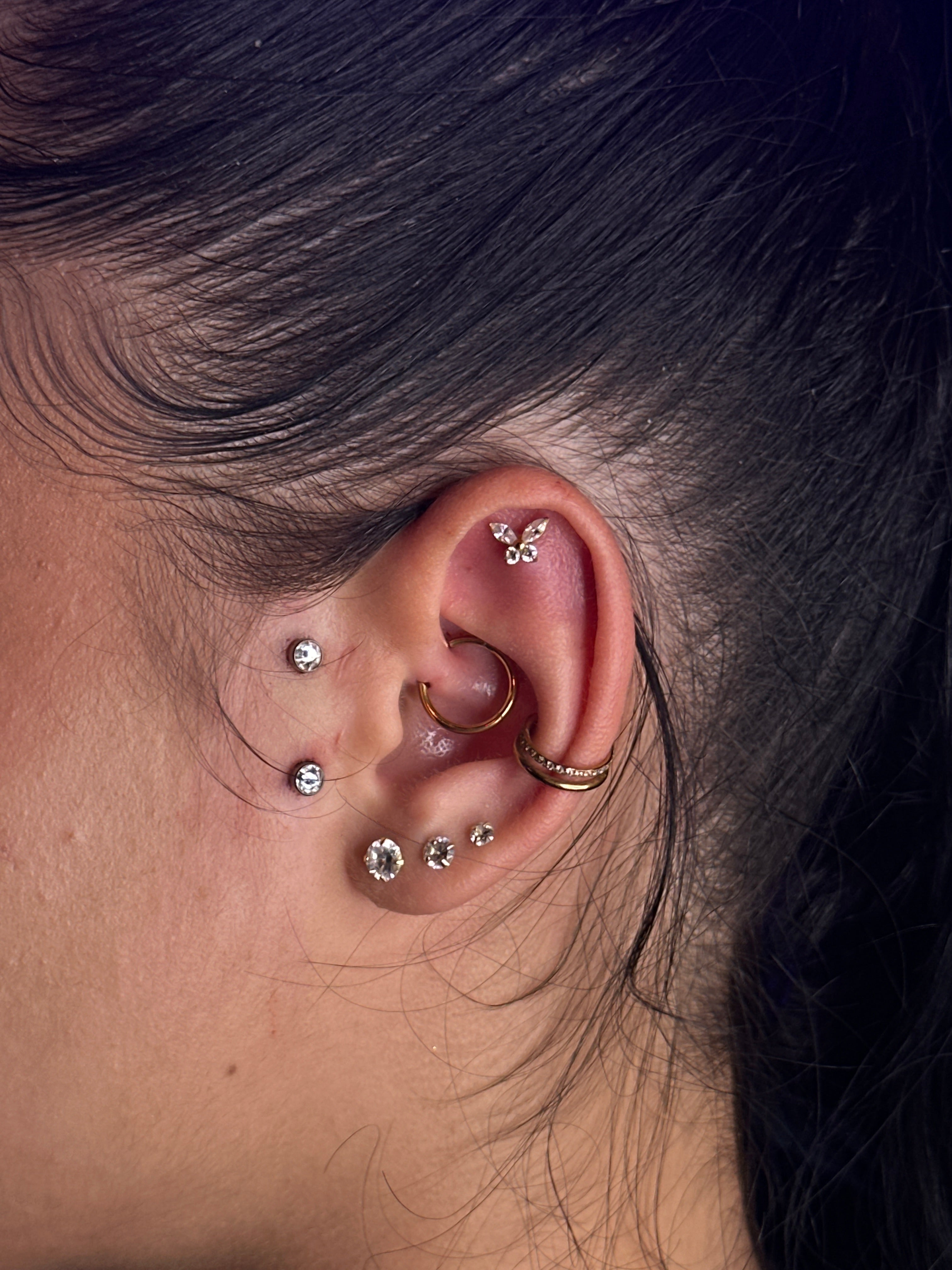 Kraakbeenpiercings vereisen speciale aandacht tijdens het genezingsproces. We raden aan de piercing altijd schoon te maken met een gesteriliseerde zoutoplossing en onnodige beweging of trauma aan het gebied te vermijden.